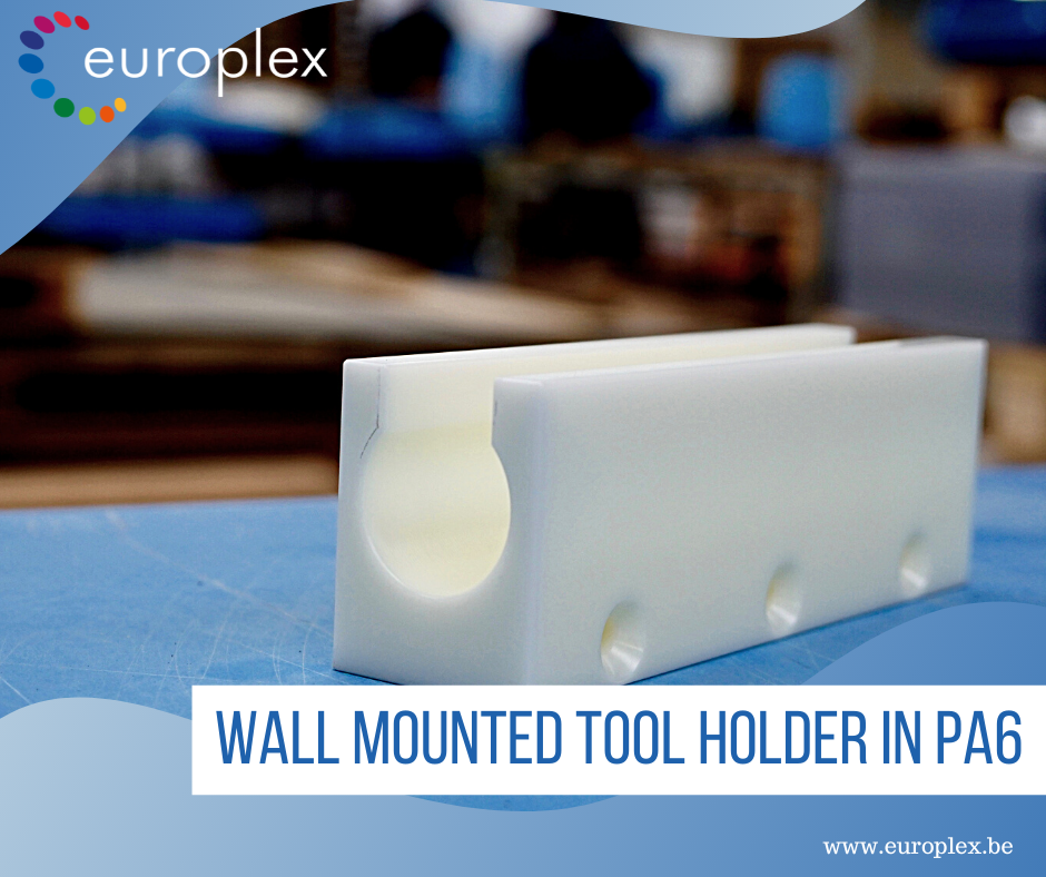 Wall mounted tool holder made in PA6. The customer chose this material because daily there are over a hundred people removing this tool and placing it back. Due to the wear and tear PA6 in an ideal product to use.